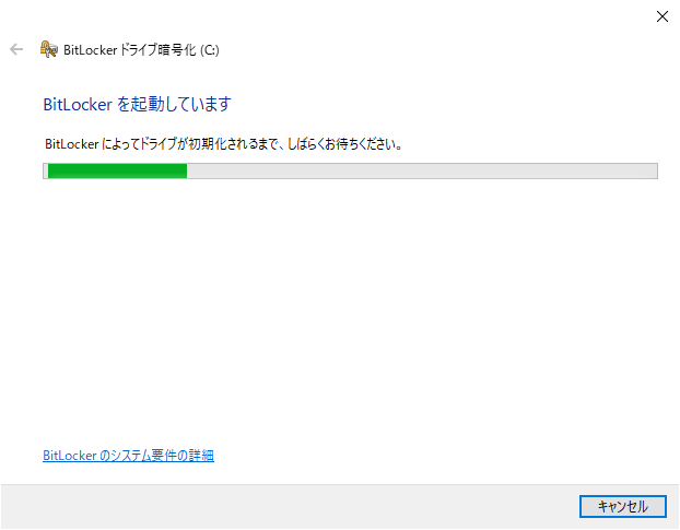 「BitLocker ドライブ暗号化」画面で、「BitLocker が有効です」になれば完了です。