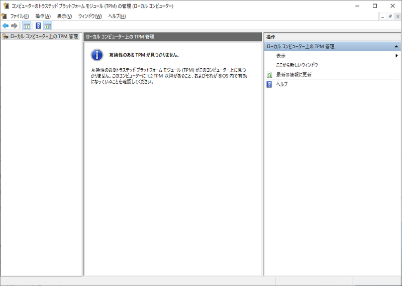 BitLockerを使うために TPMを有効にしようと思ったら、「互換性のある TPM が見つかりません。」のメッセージが。