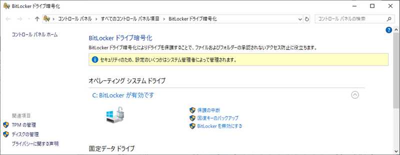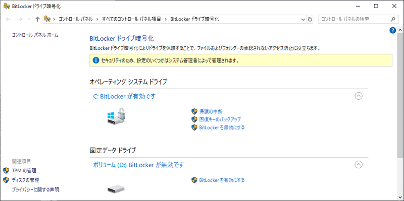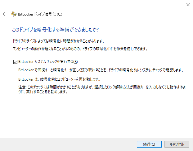 システムドライブ(Cドライブ)とそれ以外のドライブとで BitLockerで暗号化する手順が少々異なります。