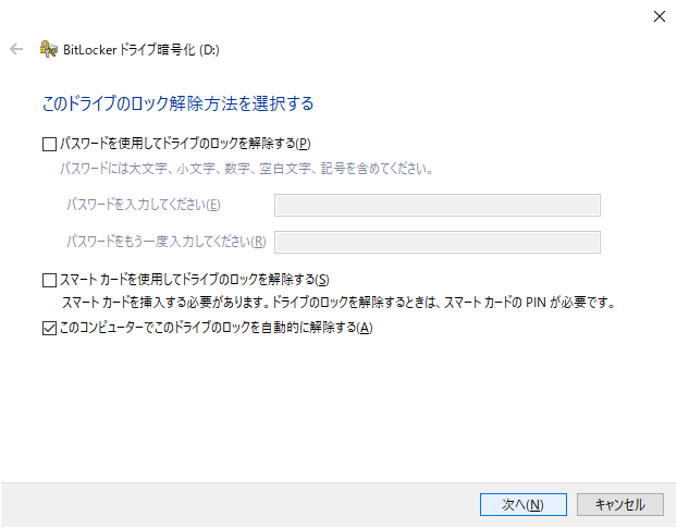 但し、このコンピュータにログオンできれば、このドライブの内容も読み書きできることになるため、セキュリティレベルを上げるなら、他の選択肢を選択する。